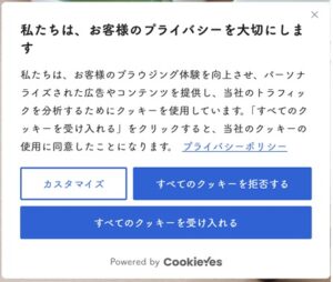 具体的な対策として、Cookie同意ボタンをサイトのトップページに設置し、利用者にCookie情報の利用規約(プライバシーポリシー等)に同意いただいてからサイトを利用していただきます。